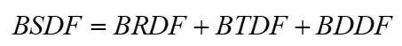 BSDF由三部分组成:双向反射分布函数(BRDF)、双向透射分布函数(BTDF)和双向衍射分布函数(BDDF)。它们之间的关系是: