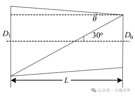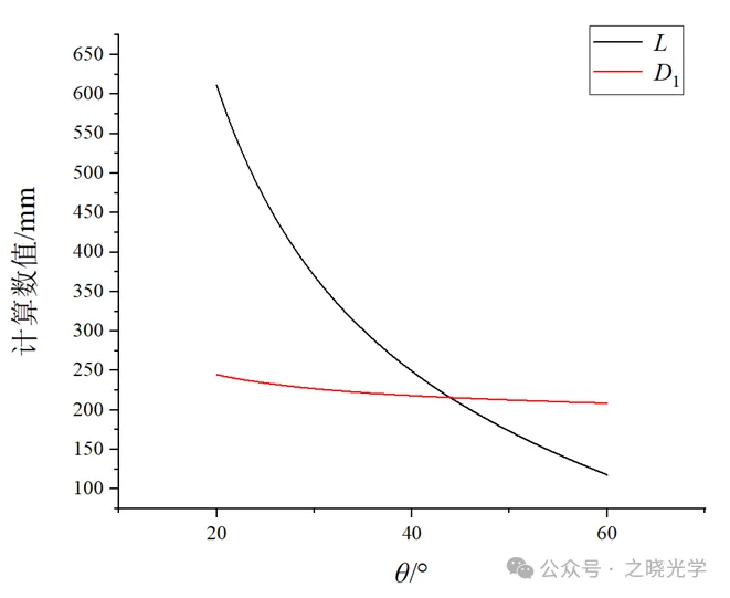 式中α为杂光抑制角,L为遮光罩长度,D0为内口径直径,D1为遮光罩直径。当光学系统口径和视场角确定之后,遮光罩外直径和长度由杂光抑制角确定,杂光抑制角变化引起的遮光罩外直径和长度变化如下图所示。