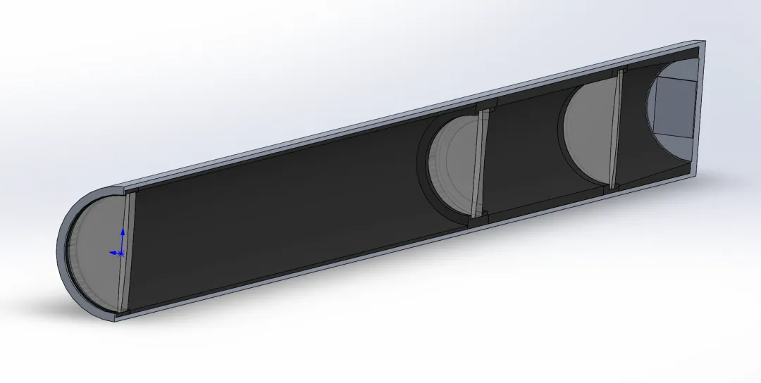 我们把这个光学设计结果导入到Solidworks里面,简单的建一下模,这里我只是演示一下操作,机械零件的建模比较随意,当然对于光机结构设计我不是专家,这方面大家可以自行查阅光机设计手册或各种资料(后面介绍点源透过率和杂光系数的时候,至少机械模型和光路产生直接作用的部分要准确,所以之后的文章可能还要再等一等~)。